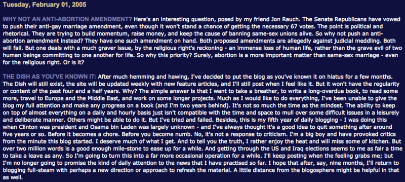 In the wee hours of February 1, 2005, Sullivan wrote: "After much hemming and hawing, I've decided to put the blog as you've known it on hiatus for a few months."