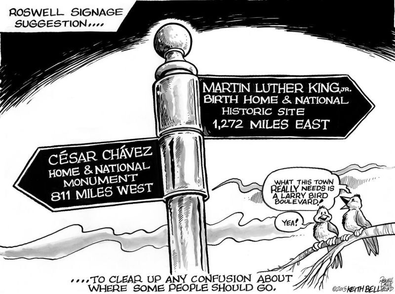 This one comes from the Roswell (NM) Daily Record. After some folks got a little upset about this one, the paper explained that "The intent was that just as Larry Bird has no connection to Roswell, neither do MLK nor César Chávez. The cartoonist meant that if we are going to have honorary street signs, the individuals named on those signs should have connections to Roswell."
