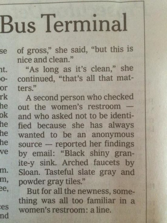 The Times had a little fun yesterday with a story about the bathrooms at Port Authority, declining to name a woman who tested one of them out "because she has always wanted to be an anonymous source." Forever making dreams come true, that paper.