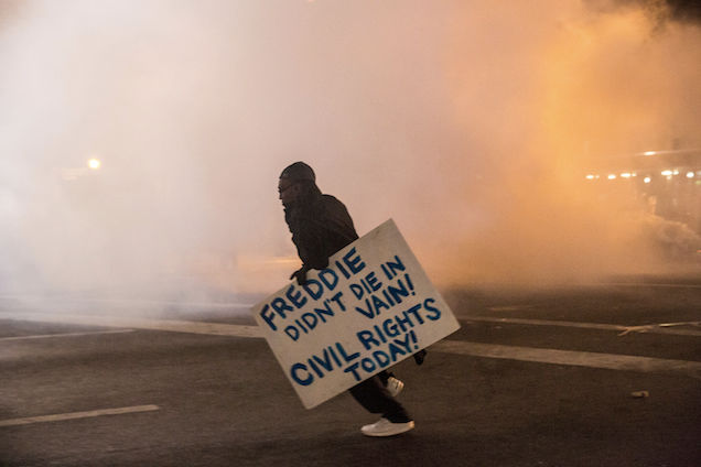 Nicholas Kristof dedicates his New York Times op-ed column to the Baltimore riots today. Even though some people say rioting is good, Kristof explains, rioting is bad. It is bad like the police snapping a man’s neck and crushing his larynx and leaving him to die is bad. The two things are just like each other: