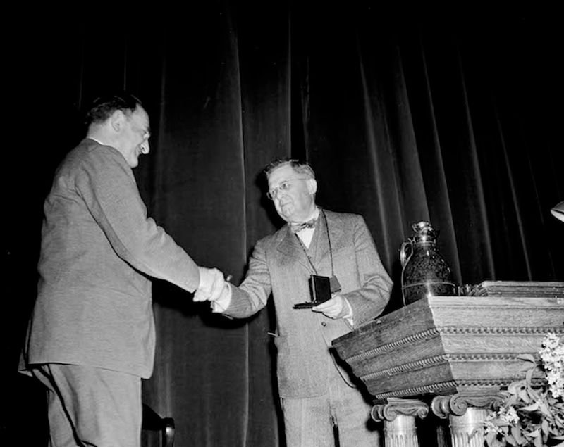 Dean Frank L. Mott, right, of the Missouri University Journalism School, presents the medal of honor to Joseph Pulitzer, president of the Pulitzer Publishing Company and publisher of the St. Louis Post-Dispatch, May 9, 1947, in Columbia, Missouri. (AP Photo/William P. Straeter)